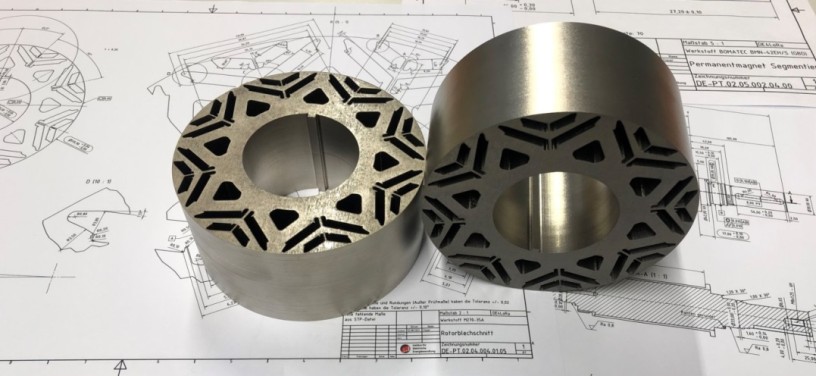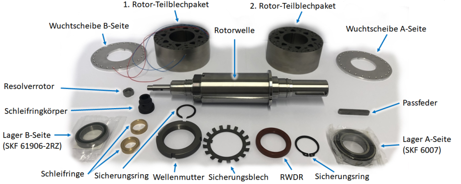 Um die Ummagnetisierungsverluste bei hohen Drehzahlen zu reduzieren, werden für den Stator und Rotor relativ dünne Elektrobleche (M270-35A) der Dicke 0.35 mm verwendet. Als Permanentmagnetmaterial wird ein hochenergetisches Neodym-Eisen-Bor-Material eingesetzt.