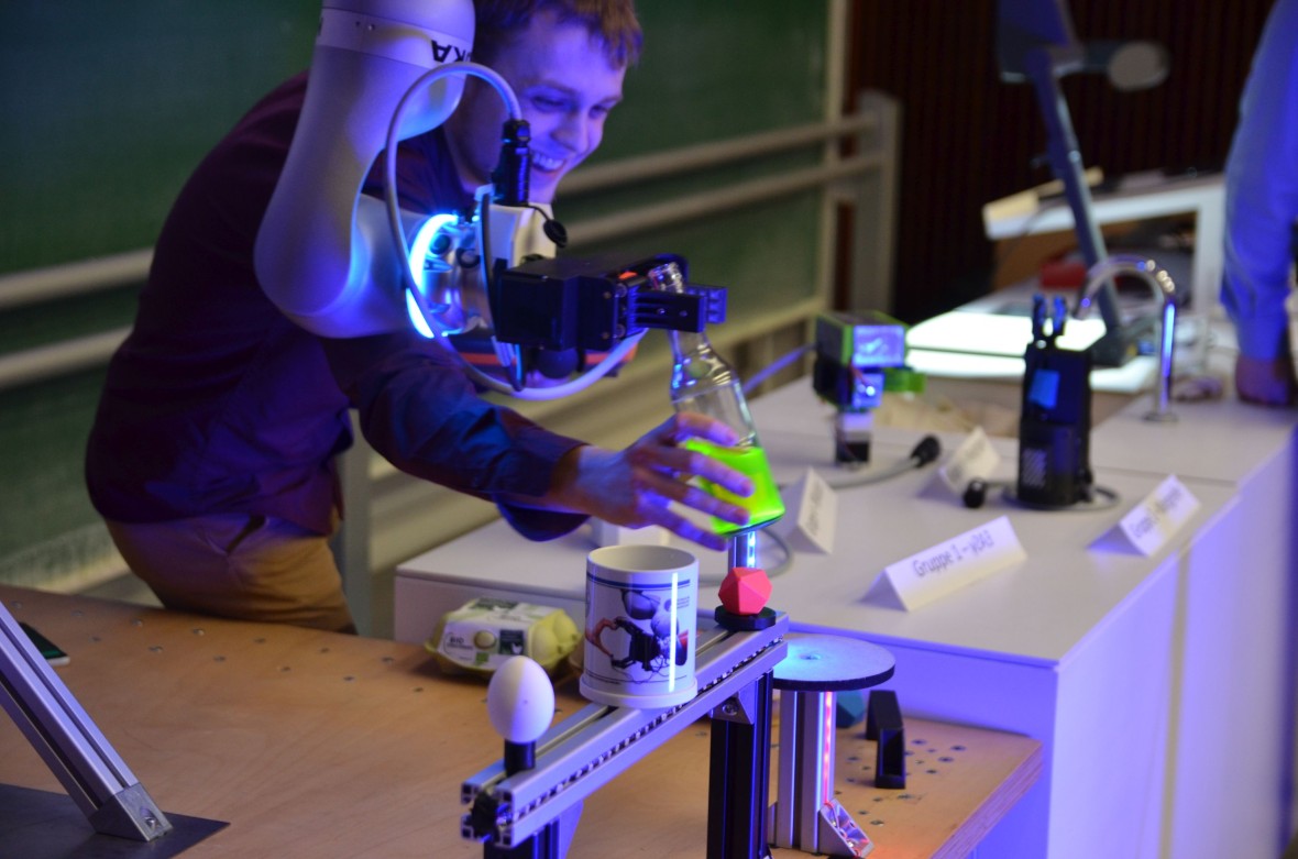 Beim Wettbewerb hatten die Wissenschaftlichen Mitarbeiterinnen und Mitarbeiter von den Fachgebieten Lichttechnik, Integrierte Elektronische Systeme, Mess- und Sensortechnik und Integrierte Mikro-Nano-Systeme für die Studierenden dann auch noch zwei Überraschungsaufgaben vorbereitet: In einer verschärften Version wurde die Kaffeetasse befüllt und somit das Gewicht deutlich erhöht. Darüber hinaus musste eine Glasflasche mit einer gelblich lumineszierenden Flüssigkeit – offensichtlich ein Gefahrgut – ebenfalls gegriffen, angehoben und dann ausgeschüttet werden.