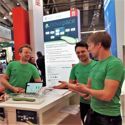 Die novapace GbR mit Beteiligung von Studierenden des Fachbereichs etit präsentierte eine sensorische Einlegesohle für modernes Gangtraining bei Parkinsonerkrankten mitsamt der entsprechenden App. Die Sohle funktioniert mit haptischer Rückmeldung und gibt bei fehlerhaftem Gang – beispielsweise bei falscher Belastung des Fußes – Fehlermeldungen aus. Auf Basis von feedbackgesteuertem Training der Gangart ermöglicht die Einlegesohle eine Individualisierung von Therapie und Medikation in Zusammenarbeit mit Ärzten und Physiotherapeuten. „Die Vorbereitung auf die Hannover Messe hat natürlich Zeit gekostet.“, sagte Simon Staffa, der zusammen mit den beiden novapace-Mitgründern Patrick Scholl und Lukas Braisz am Stand vertreten war. Unterstützung erhielten die Gründer von HIGHEST, dem Innovations- und Gründungszentrum der TU Darmstadt. „Für uns Absolventen ist es sehr angenehm, dass wir einfach in Kontakt mit Professoren und wissenschaftlichen Mitarbeitern treten können und so für fast jede Frage Experten finden.“