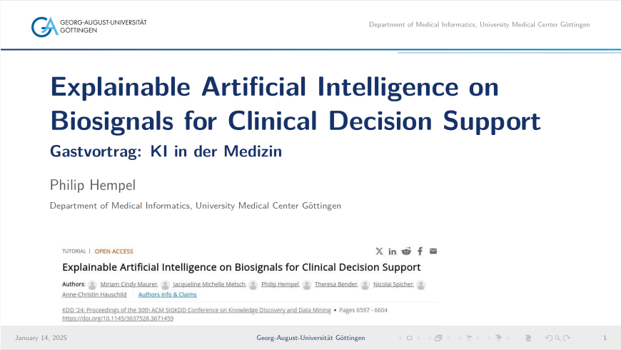 Am Montag, 13.01., stattete Philip Hempel von der Medizininformatik der Georg-August-Universität Göttingen KIS*MED einen Besuch ab. Im Gepäck hatte er einen Vortrag zum Thema „Explainable Artificial Intelligence on Biosignals for Clinical Decision Support“. Durch seine Ausbildung zum Notfallsanitäter und langjährige Erfahrung im Rettungsdienst kennt er die Schwierigkeiten, welche bei Diagnosen unter Zeitdruck auftreten und noch dazu eine Vielzahl von Krankheitsbildern. In seiner Forschung beschäftigt er sich seit 3 Jahren mit der Anwendung und Entwicklung von KI Tools zur Diagnostik auf Basis von Biosignalen, wie dem Elektrokardiogramm (EKG). Diese Kombination aus Informatik und medizinischer Praxis verwandelte er in einen spannenden Vortrag mit vielen Beispielen zur Anwendung von Explainable AI und wahren Geschichten aus dem medizinischen Alltag.